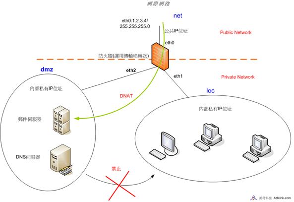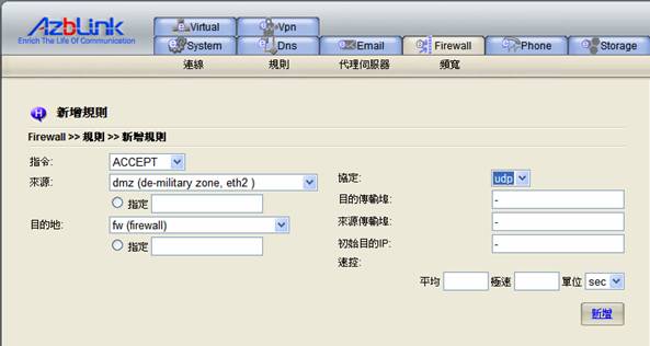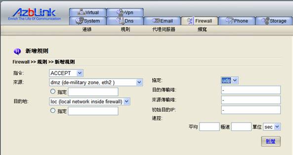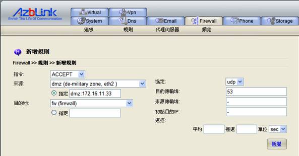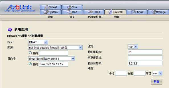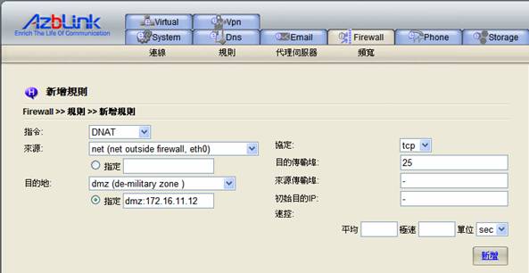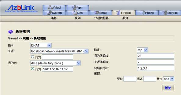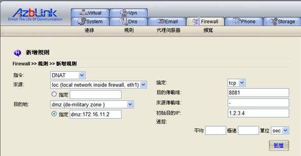 在我們的系統中,想要讓“DMZ”不完全依照預設的“非軍事區域”,您必須使用“進階選單”中的“DNAT”動作,將傳輸轉送進入DMZ中的特定主機。
