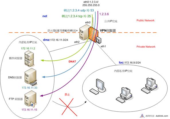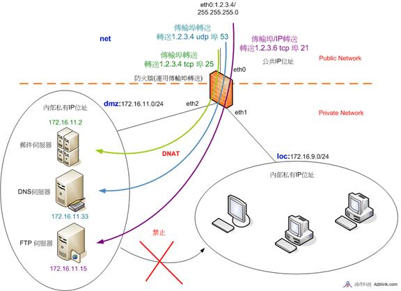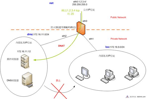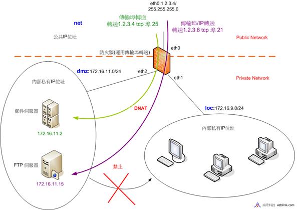 例如,我們想要將某傳輸,關聯IP位址為“1.2.3.4”、TCP端口為25,轉送給DMZ中的私有IP位址172.16.11.12的某主機,