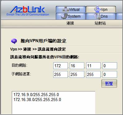 基本上要打開傳輸埠110,在安全性的考量上是有些不妥的,要避免這種情形,您可以搭配VPN方案來解決這個困擾。不過,要使用VPN,在設定上需注意到,雖然VPN是可以穿越邊界控制路由的虛擬通道,但是您必須明確指定路徑,VPN才能暢行。所以在 VPN >> 連接 >> 訊息流推向設定 裡,一定要記得將VPN的訊息導向加入“DMZ”的子網路,如此才能順利的使用Outlook或 Outlook Express郵件用戶端程式在邊界控制路由外來收發信件。