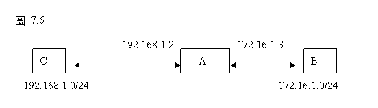 在圖表中,機器A擁有兩個乙太網路界面,IP位址分別是192.168.1.2 和172.16.1.3。它居於網路192.168.1.0/24和172.16.1.0/24之間,擁有將數據封包從一個界面傳送到另一個界面的能力。機器B位於網路172.16.1.0/24中,機器C位於網路192.168.1.0/24中。如果B發出一個目的IP位址是C的數據封包,它需要作哪一類的設定才能到達C呢?
