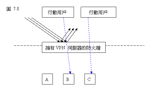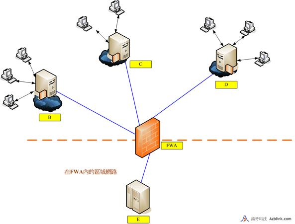 在下圖中,伺服器B、C和D可以被配置為“移動端-對-站 的VPN 用戶端”,FW A可被設為“移動端對站”的VPN 主機。所以,B、C和D可以存取到在邊界控制路由內部的超級伺服器E。然而,B、C和D的用戶端則無法按照VPN連接去追蹤到E。