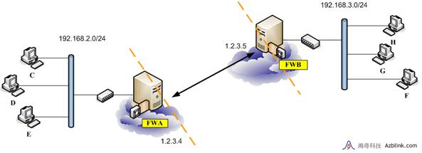 在上述的圖示中,我們要配置邊界控制路由A和B,這樣網路192.168.2.0/24中的機器C、D和E就可以穿過兩個邊界控制路由,存取到網路192.168.3.0/24中的H、G和F。假設邊界控制路由A和B分別擁有固定的公共IP位址1.2.3.4、1.2.3.5。