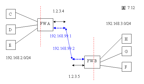 目的網路: 192.168.99.2 (對方<FWB>的本地通訊管道器位址 )