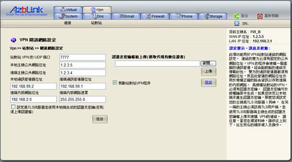 因為,在一個站對站(Site-to-Site)的VPN網路環境裡,只能允許一個TLS伺服器的存在。所以,當FW A已經設定為TLS伺服器之後,其他要與FW A共構站對站(Site-to-Site) VPN的其他網路就只能充當TLS用戶端。因此,您應將方才從FW A上獲取的密鑰,上傳到成為TLS用戶端的FW B機器中。並點選“啟動站對站VPN程序”送出。然後,重啟機器。