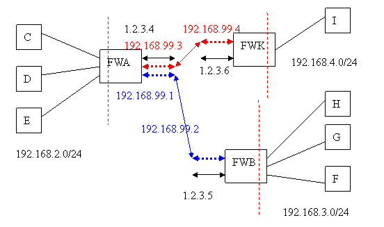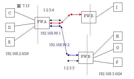在下圖中,FW A和FW B透過“站對站(Site-to-Site) VPN”來連接,這樣它們背後的區域網路可以為對方所見。同時FW A和FW K用“另一個UDP端口上的 “站對站(Site-to-Site) VPN”來連接。這種情況下,我們將FW A稱為“VPN多路傳輸器”。