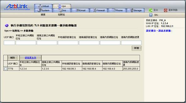 操作原理是︰在FW A上有若干“站-對-站 VPN”在不同的UDP端口運作著,新增額外的“站-對-站 VPN”作為TLS 伺服器,可以透過VPN >> 站對站 >> 多路傳輸 進行處理。對於FW K內部的網路,您應使用不同的UDP端口、一組不一樣的通訊管道IP位址,以及不同的LAN位址。