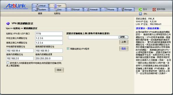 且須核取項目“設定為TLS 伺服器並使用本地端生成的認證及密鑰”送出,使之成為TLS伺服器。並選取“啟動站對站VPN程序”,在按下送出後,重新啟動機器。