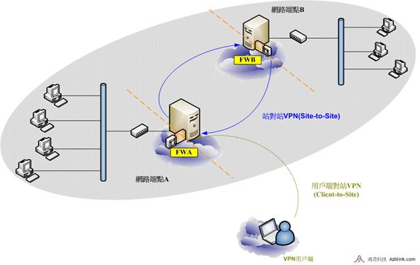 在上圖中,網路端點A上的各部分都需要存取網路端點B上的機器。所以,FWA和FWB可以建立起一個 站對站(Site-to-Site) VPN連接。同時,某些旅行在外的人們想要連接回網點A處的辦公室。此時,可以在FWA上建立一個“用戶端對站 VPN 主機”。這樣,FWA上就有兩個模式(mode)在運作︰“站對站(Site-to-Site)”的VPN和 “用戶端對站”的VPN。