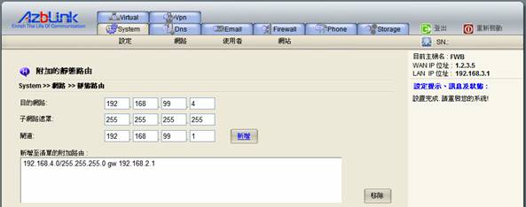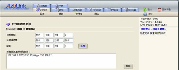 同理,FWK的伺服器上,也需在System >> 網路 >> 靜態路由 的頁面做同樣的設定。