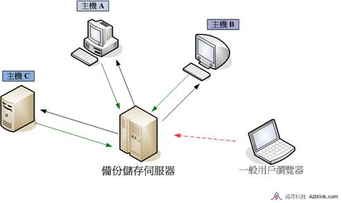 - 每一個用戶可將其它非備份主機機器的適當資訊,設定到備份主機上,備份主 機會在設定的特定時間,主動到這些機器上,將資料備份到資料備份儲存伺服器上。