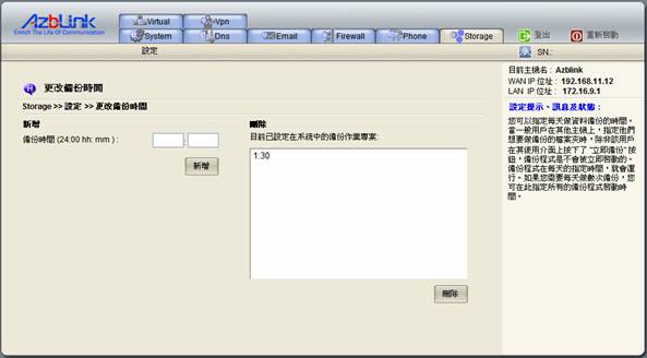 您可以指定每天進行資料備份的時間。當一般用戶在其他主機上指定他們想要做備份的檔案夾時,除非用戶在用戶端網頁中按了 立即備份 按鈕,否則備份程式不會立即啟動。每天一到指定的時間,備份程式就會自動運行。如果需要每天進行數次備份,你可在此指定啟動備份的所有時間。