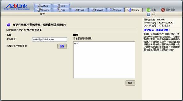 如備份資料量超過硬碟容量的指定百分比,伺服器會發出警報。備份規則 中可以設定此百分比以及郵件清單。當硬碟使用量超過了此設定的百分比時,系統會向郵件清單中的每個人發出郵件。